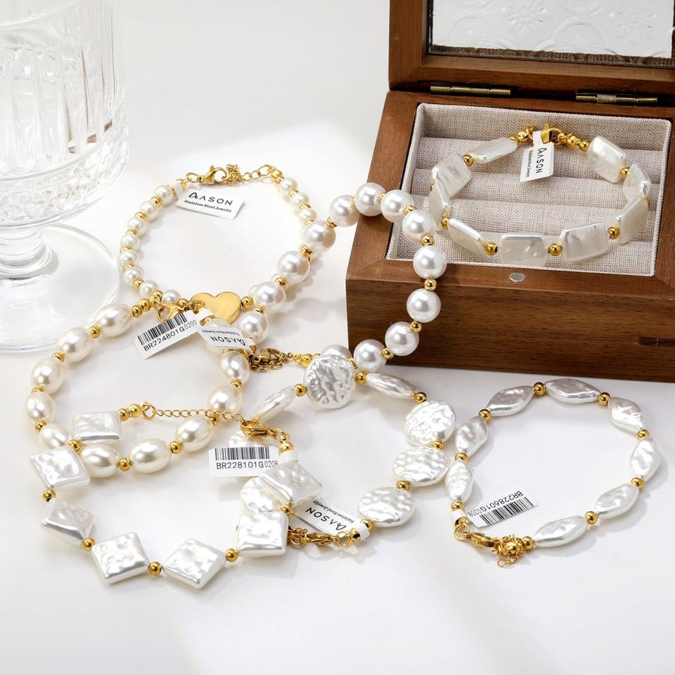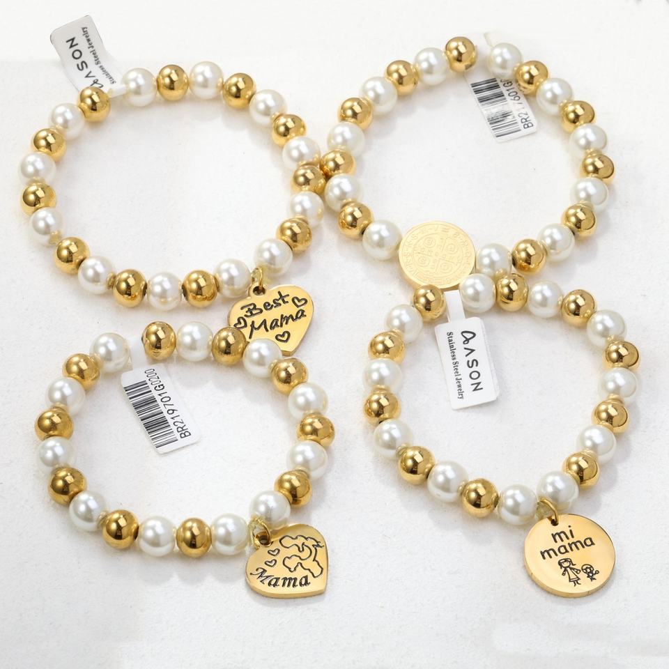 กำไลข้อมือแฟชั่นดีไซน์สแตนเลสสตีลชุบทอง 18k กันน้ำ ประดับด้วยจี้รูปทรงสี่เหลี่ยม วงกลม ดาว และไข่มุก สำหรับผู้หญิง
