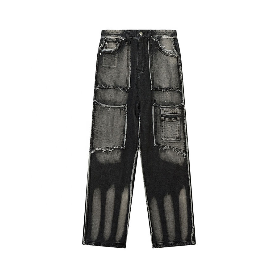 กางเกงยีนส์ดีไซน์เนอร์แฟชั่น สไตล์สตรีท ลุคสแวนด์ แซนด์ สโนว์ แครช วินเทจ วอชชิ่ง แพทช์เวิร์ค แบบคัสตอม ลำลอง สำหรับผู้ชาย สตรีทแวร์ ทรงกลาง 100%