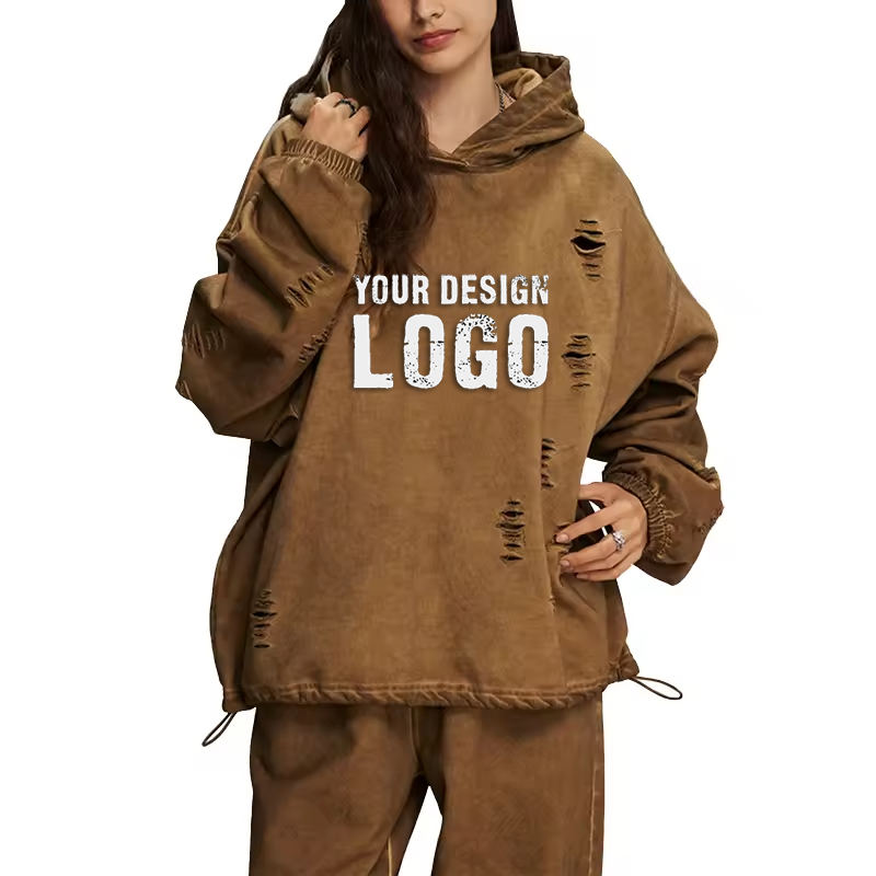 เสื้อฮู้ดดี้ผู้หญิงทรงหลวมสไตล์วินเทจ ลุคสบายๆ สำหรับใส่เที่ยวข้างนอก สีฟอกแบบดิสเทรส ทรงหลวมไหล่ตก