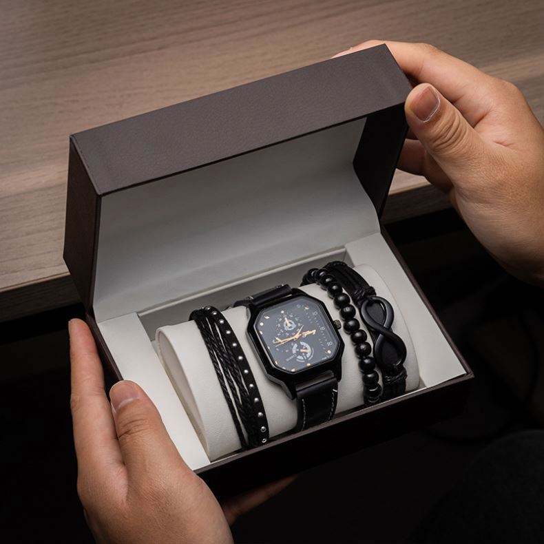 ชุดกำไลข้อมือหนังทรงสี่เหลี่ยมสองชั้น ดีไซน์แฟชั่น สไตล์ลำลองสำหรับผู้ชาย ชุดของขวัญสุดหรูสำหรับวันพ่อ