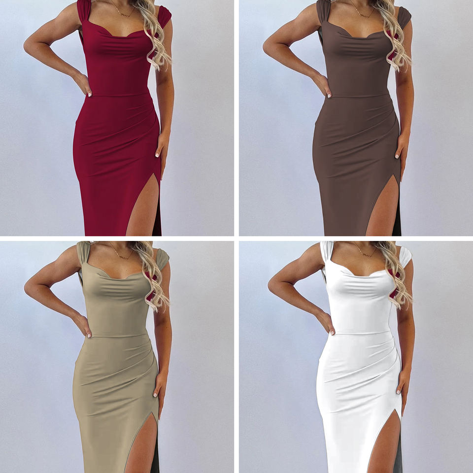เดรสยาวผ่าข้างรัดรูปแฟชั่นสวยหรูเซ็กซี่สำหรับสาวๆ แบบลำลองผ้าทอสีพื้น ฤดูร้อน 2025 เสื้อผ้าผู้หญิงแขนกุด