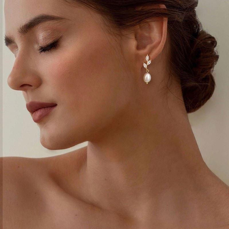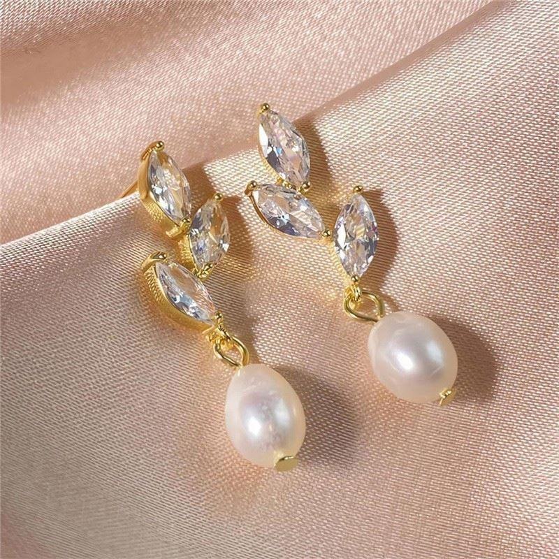 ต่างหูแฟชั่นชุบทอง โลหะผสมสังกะสี ประดับเพชรเซอร์โคเนีย ดีไซน์ดอกไม้ใบไม้ประดับมุก สวยหรู ประณีต เหมาะสำหรับเจ้าสาว ระยิบระยับ สำหรับผู้หญิง