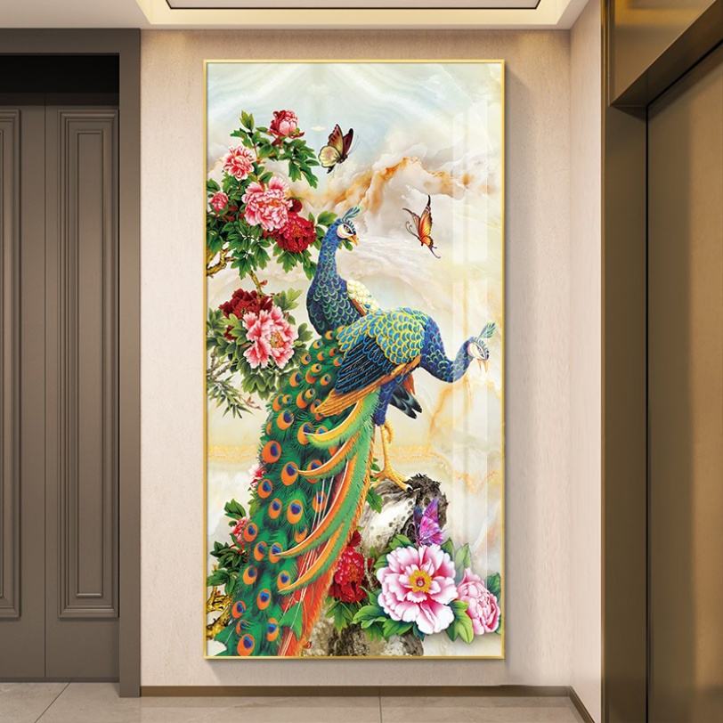 ภาพพิมพ์แฟชั่น HD สีสันสดใส ลายนกยูง คริสตัล พอร์ซเลน ภาพวาดตกแต่งบ้าน ห้องนั่งเล่น ทางเดิน ทางเข้า พร้อมไฟ LED ติดผนัง