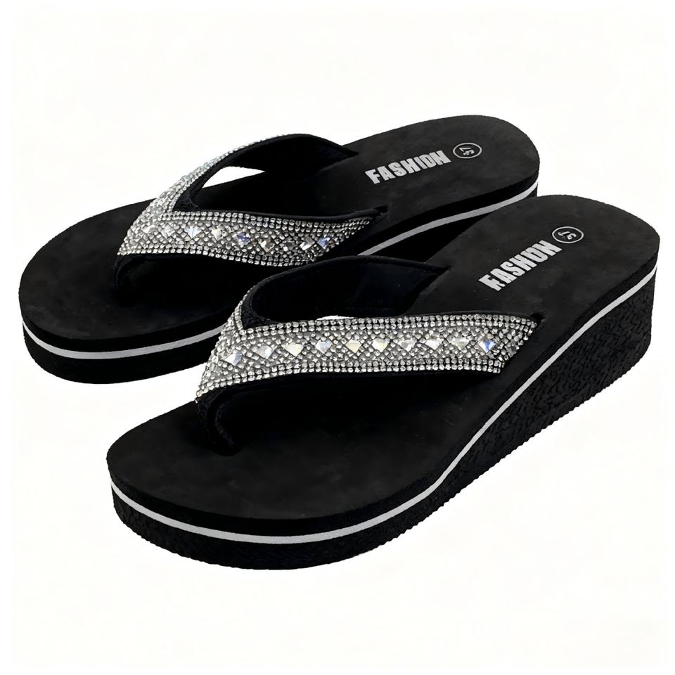 รองเท้าส้นตึกแบบสวมประดับเพชร สายรัดกว้าง สีดำ พื้นหนา รองเท้าแตะชายหาด รับทำโลโก้