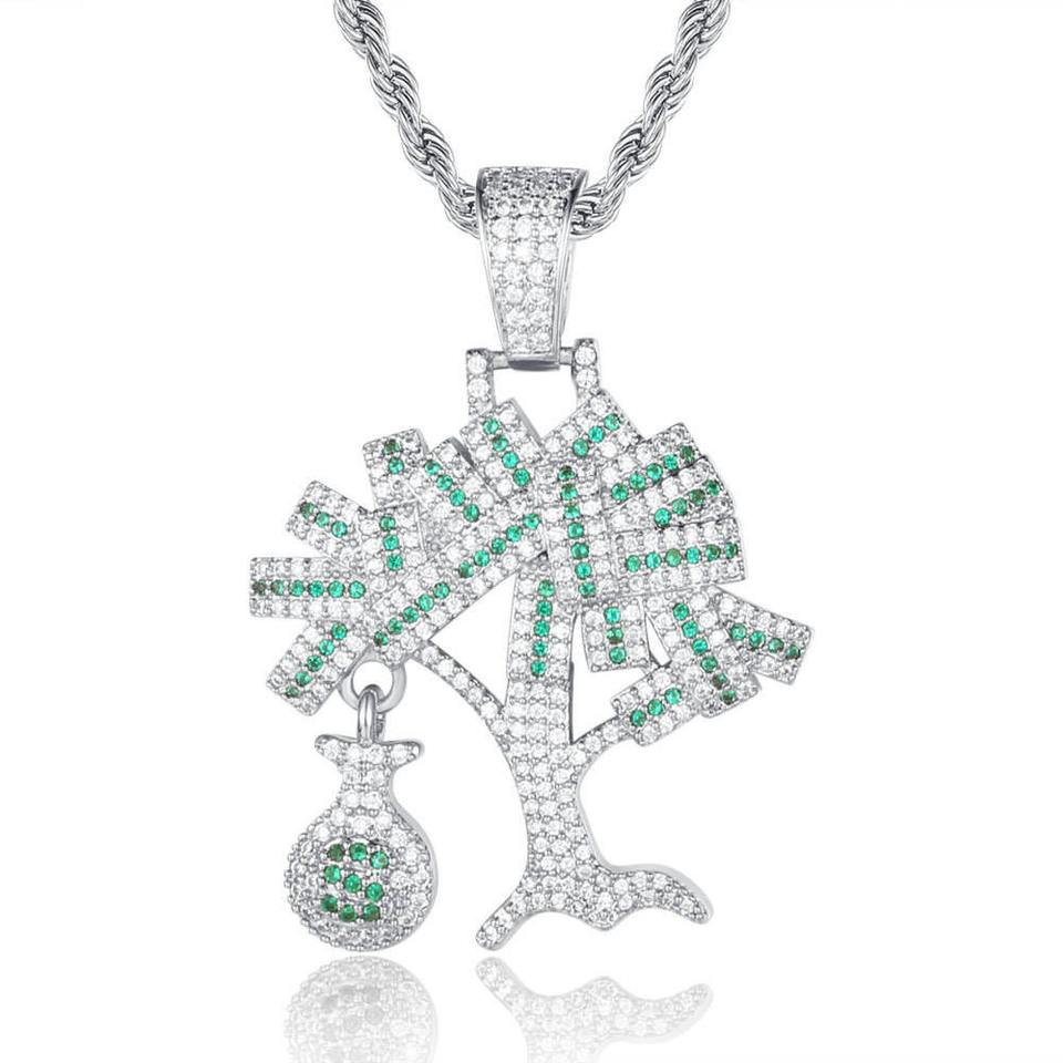 สร้อยคอแฟชั่นฮิปฮอปแบบ Iced Out ชุบทอง 18k ประดับโมอิสซาไนต์รูปต้นไม้แห่งความมั่งคั่ง พร้อมสายสร้อยแบบเชือกสำหรับผู้ชาย