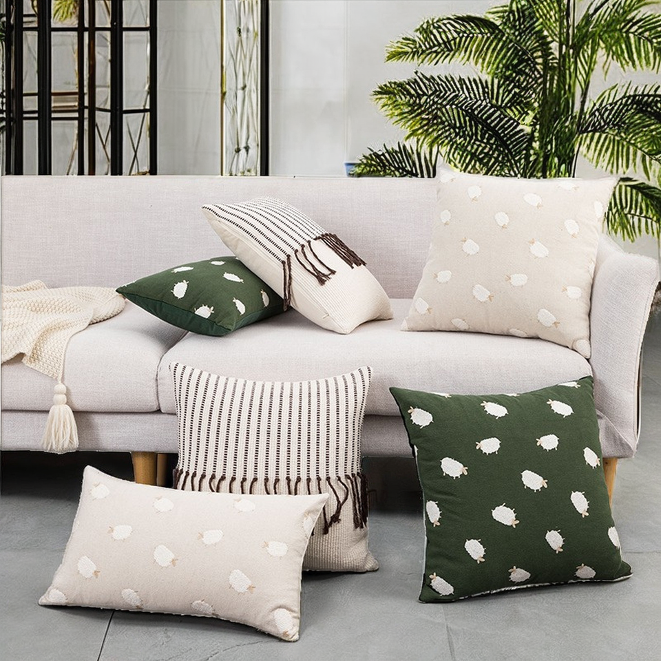 ปลอกหมอนปักลายสัตว์ตกแต่งบ้านและโรงแรม สีเขียวเซจ ขนาด 45x45 ซม. ซักได้ ผลิตจากผ้าฝ้าย/ลินินเนื้อนุ่ม