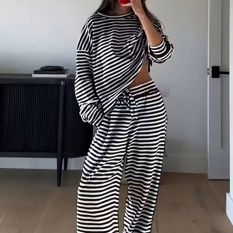 ชุดเซ็ต 2 ชิ้น แฟชั่นขายดี ฤดูใบไม้ผลิ 2026 ลายทาง แขนยาว ระบายอากาศได้ดี เป็นมิตรกับสิ่งแวดล้อม ชุดลำลองสำหรับผู้หญิง แบรนด์ Ohsisa