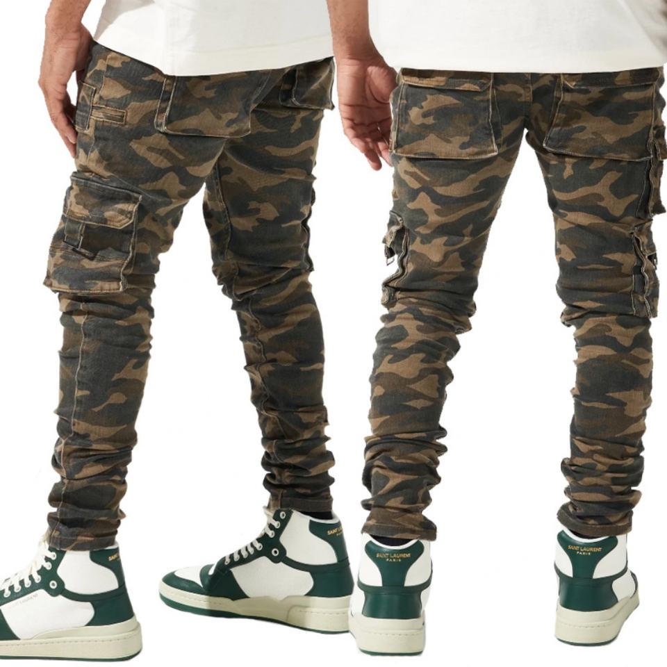 กางเกงยีนส์แฟชั่นผู้ชายทรงสกินนี่แบบซิป มีกระเป๋าคาร์โก้ลายพราง