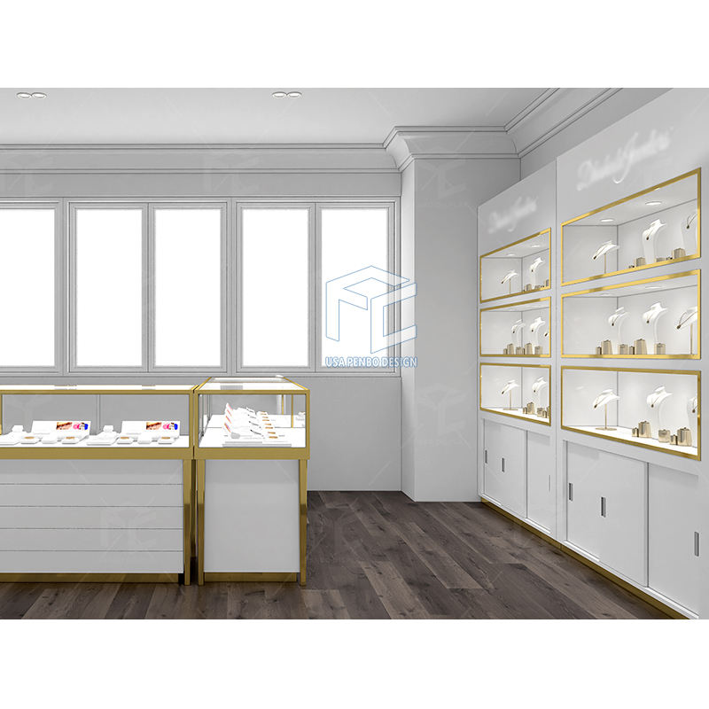 แฟชั่นเครื่องประดับตู้แสดงหรูหราขายปลีกร้านขายนาฬิกาแก้วเคาน์เตอร์แสดงที่กําหนดเองร้านขายเครื่องประดับการออกแบบเฟอร์นิเจอร์