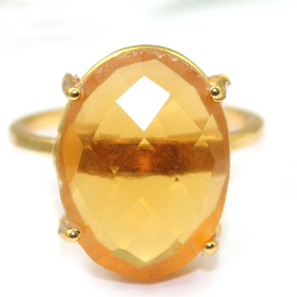 เครื่องประดับแฟชั่นแหวนทองเหลืองชุบทองปรับขนาดได้แหวนควอตซ์หิน Citrine เหลี่ยมเพชรพลอย Citrine QUARTZ รูปไข่