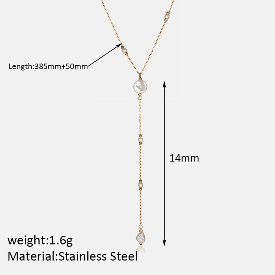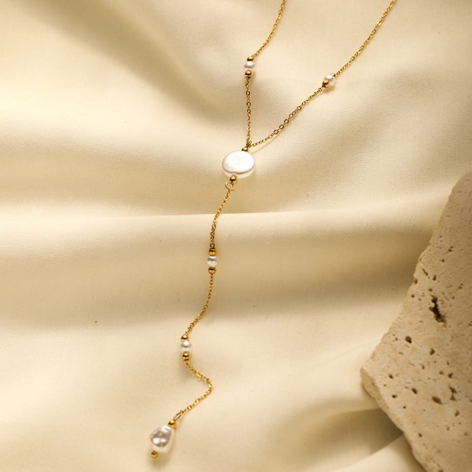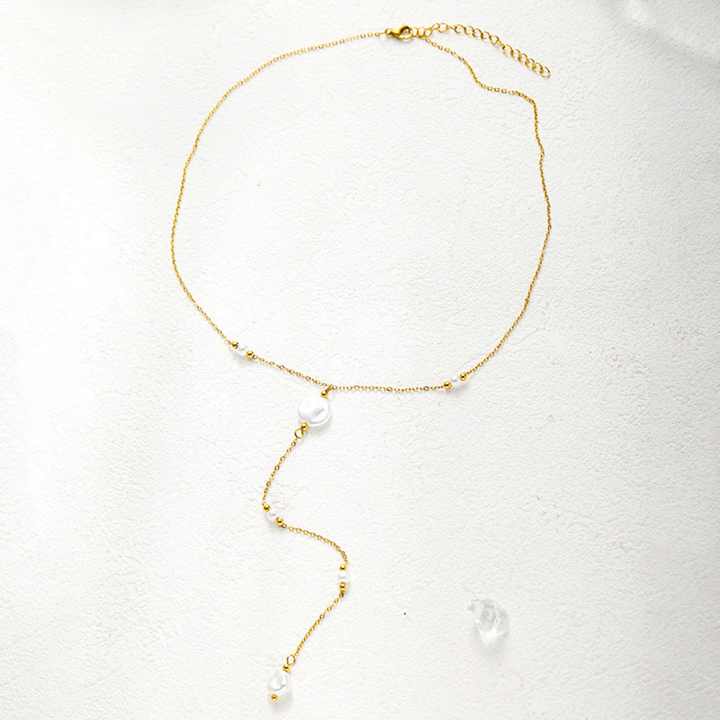 เครื่องประดับแฟชั่น ไม่ลอก ไม่ดำ ขายส่ง สร้อยคอเหล็กกล้าไร้สนิม ชุบทอง 18K ทรงกลม รูปตัว Y ประดับมุก สำหรับผู้หญิง