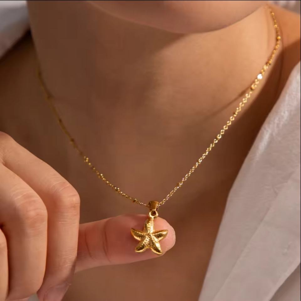 สร้อยคอแฟชั่นชุดโอเชียน ชุบทอง 18K สแตนเลสประดับมุก รูปดาวทะเลและเปลือกหอย สำหรับผู้หญิง