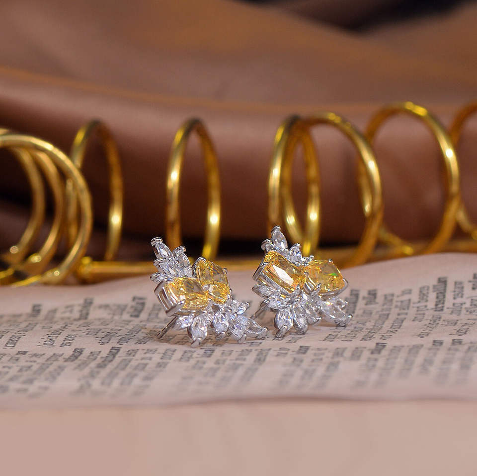 เครื่องประดับแฟชั่น เงินประดับเพชรคิวบิกเซอร์โคเนียสีเหลืองทรงกลม 8x10 มม. ต่างหูรูปดอกไม้ชุบโรเดียม โรแมนติกสำหรับงานแต่งงาน