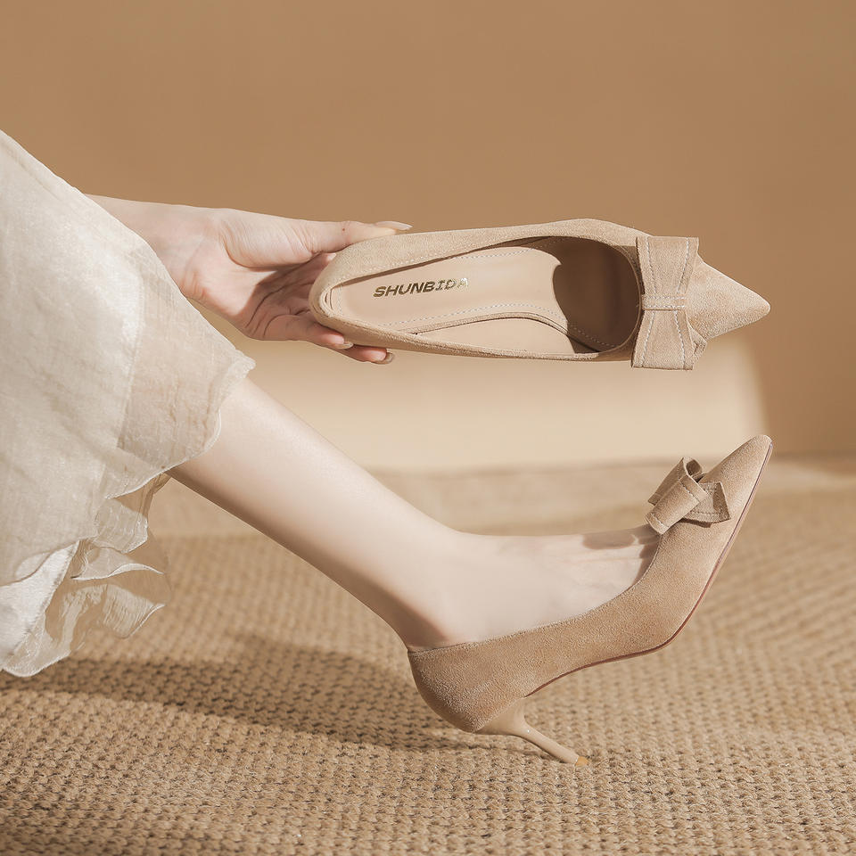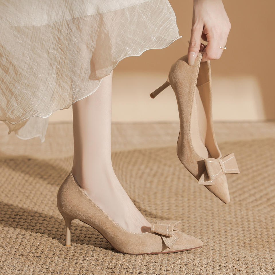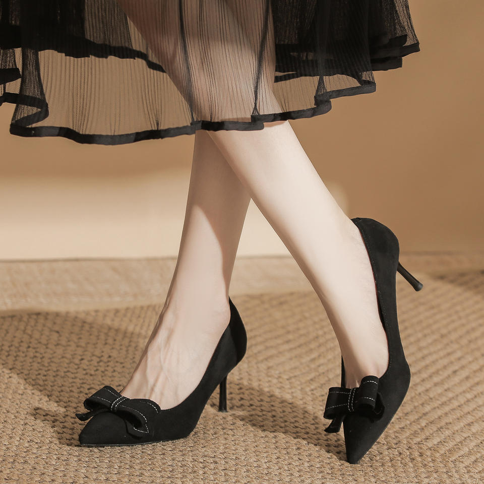 รองเท้าส้นสูงทรงหัวแหลมสไตล์เกาหลี ผ้าหนังกลับ ประดับโบว์ สวมใส่สบาย เหมาะสำหรับผู้หญิง ใส่ได้ทุกวัน สีนู้ด สีดำ สูง 6 ซม.
