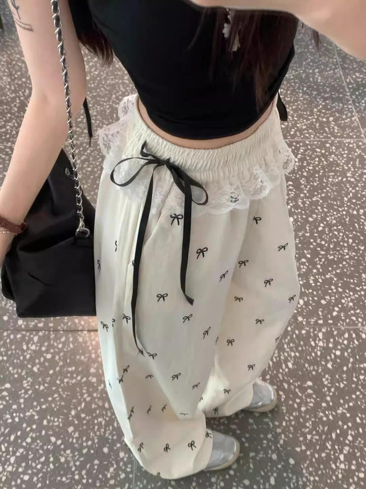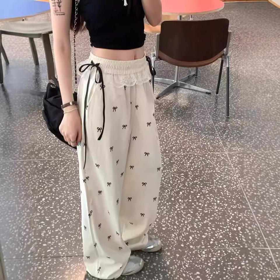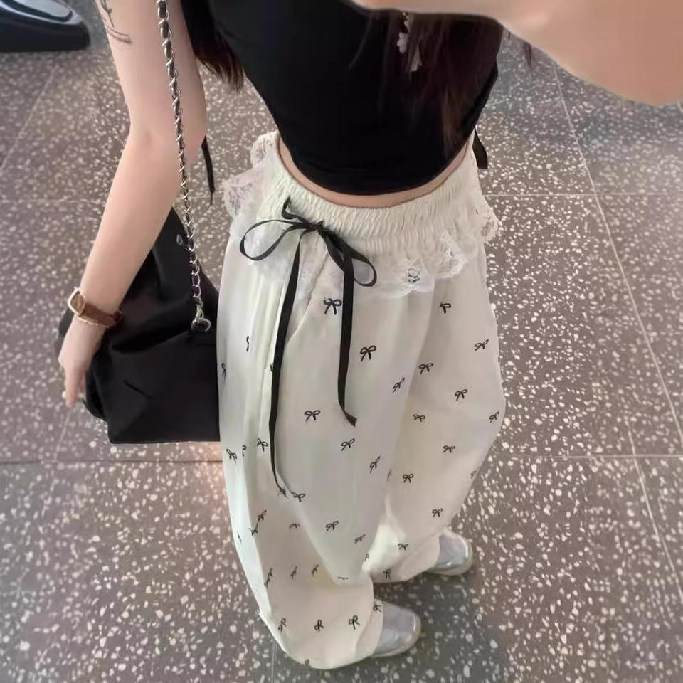 กางเกงลำลองแฟชั่นลูกไม้ปะติดสำหรับผู้หญิงกางเกงจ๊อกกิ้งพิมพ์ลายเพรพปี้โบว์ทรงหลวมสำหรับฤดูร้อนกางเกงเอวสูงเข้าได้กับทุกชุด