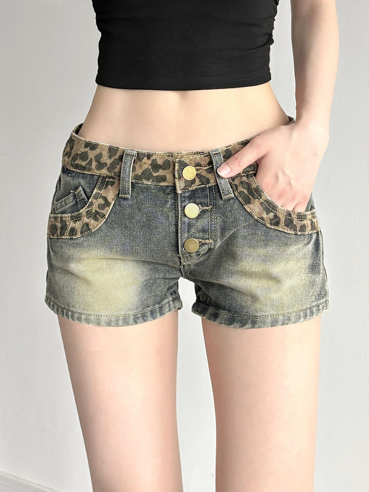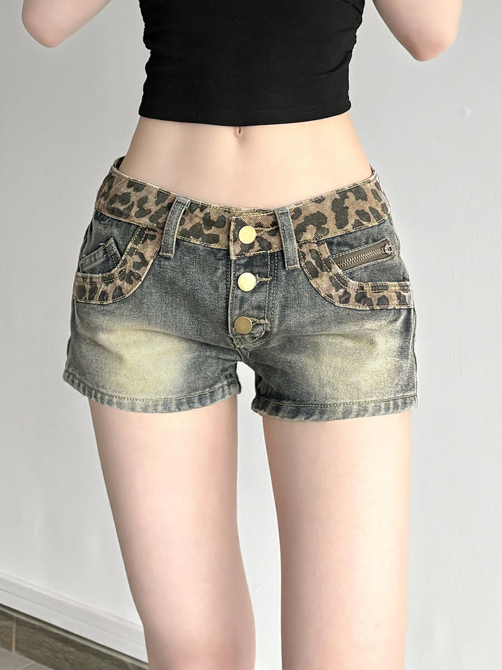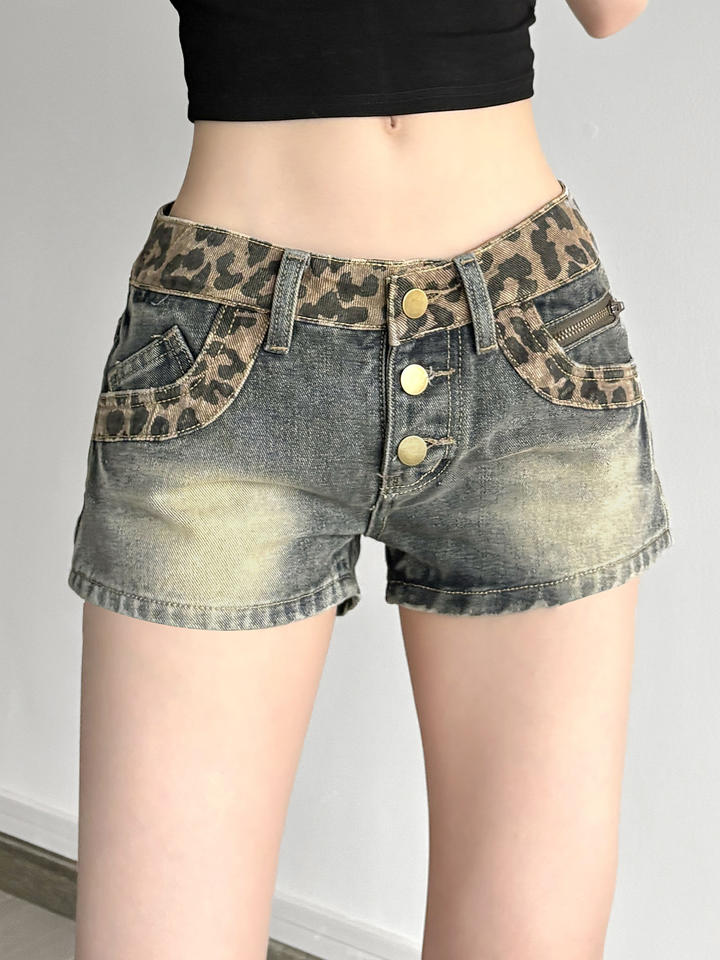 กางเกงยีนส์ขาสั้นสำหรับผู้หญิง, กางเกงยีนส์ขาสั้นปะต่อลายเสือดาวแฟชั่นฤดูร้อนสุดชิคกางเกงขาสั้นแบบลำลอง