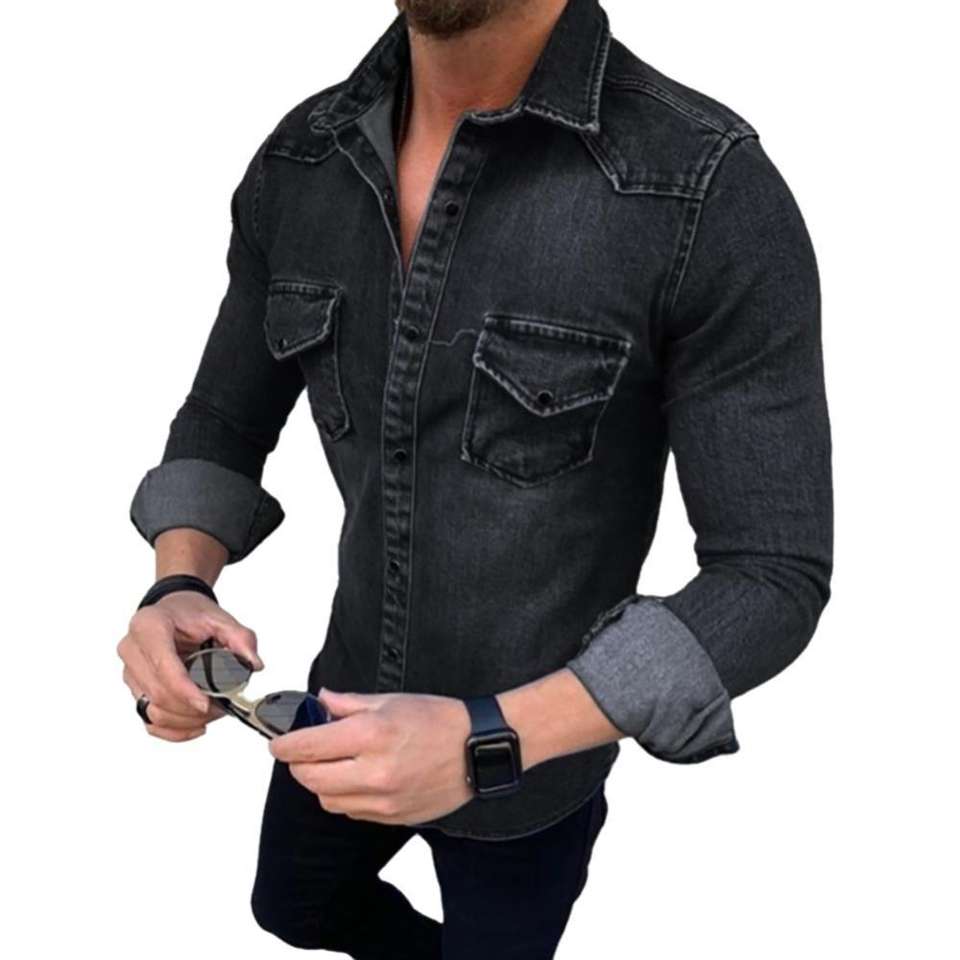 เสื้อยีนส์คอปกแขนยาวเข้ารูปแฟชั่นเสื้อยีนส์มีกระเป๋าเสื้อลำลองสำหรับผู้ชายเสื้อยีนส์2024สีดำ XL