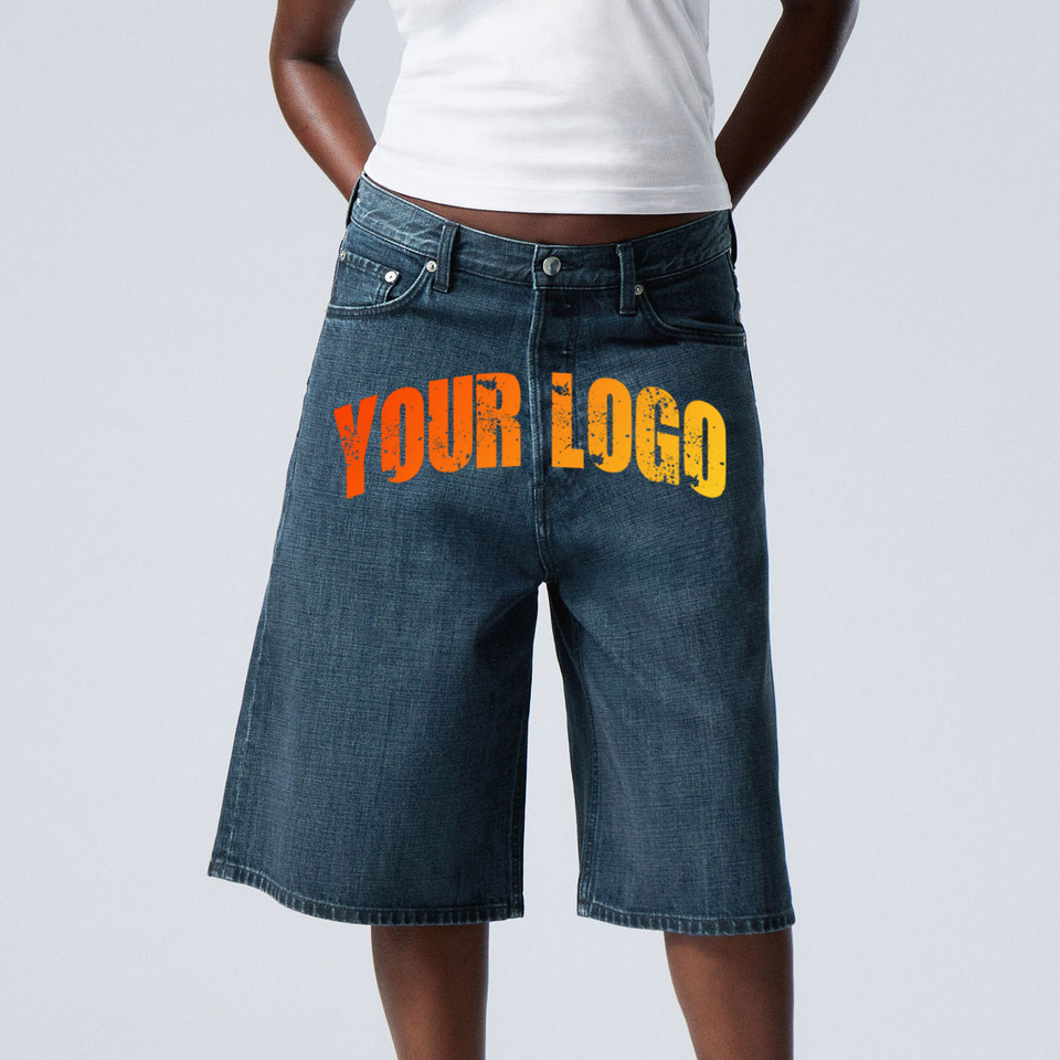 กางเกงยีนส์ขาสั้นแฟชั่นผู้ชายสไตล์สตรีทแวร์ปักลายแบบกำหนดเอง ลุควินเทจทรงหลวม แต่งแพทช์ขาดๆ แบบโอเวอร์ไซส์ ขายส่ง