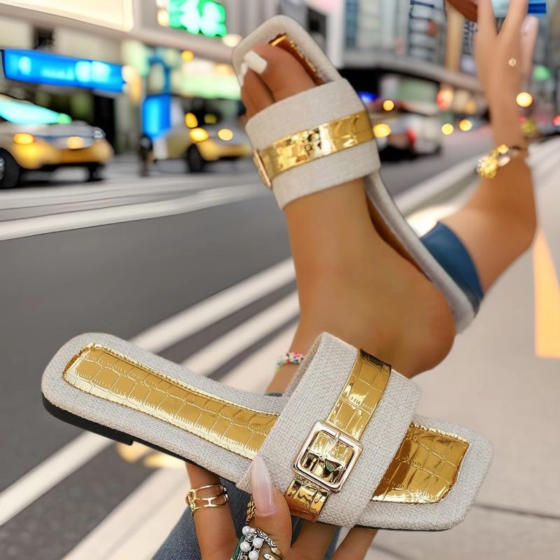 รองเท้าแตะส้นเตี้ยหัวเข็มขัดโลหะแฟชั่นรองเท้าแตะชายหาดกันลื่นสำหรับผู้หญิง2025ฤดูร้อนรองเท้าแตะผู้หญิงขนาดพิเศษ43