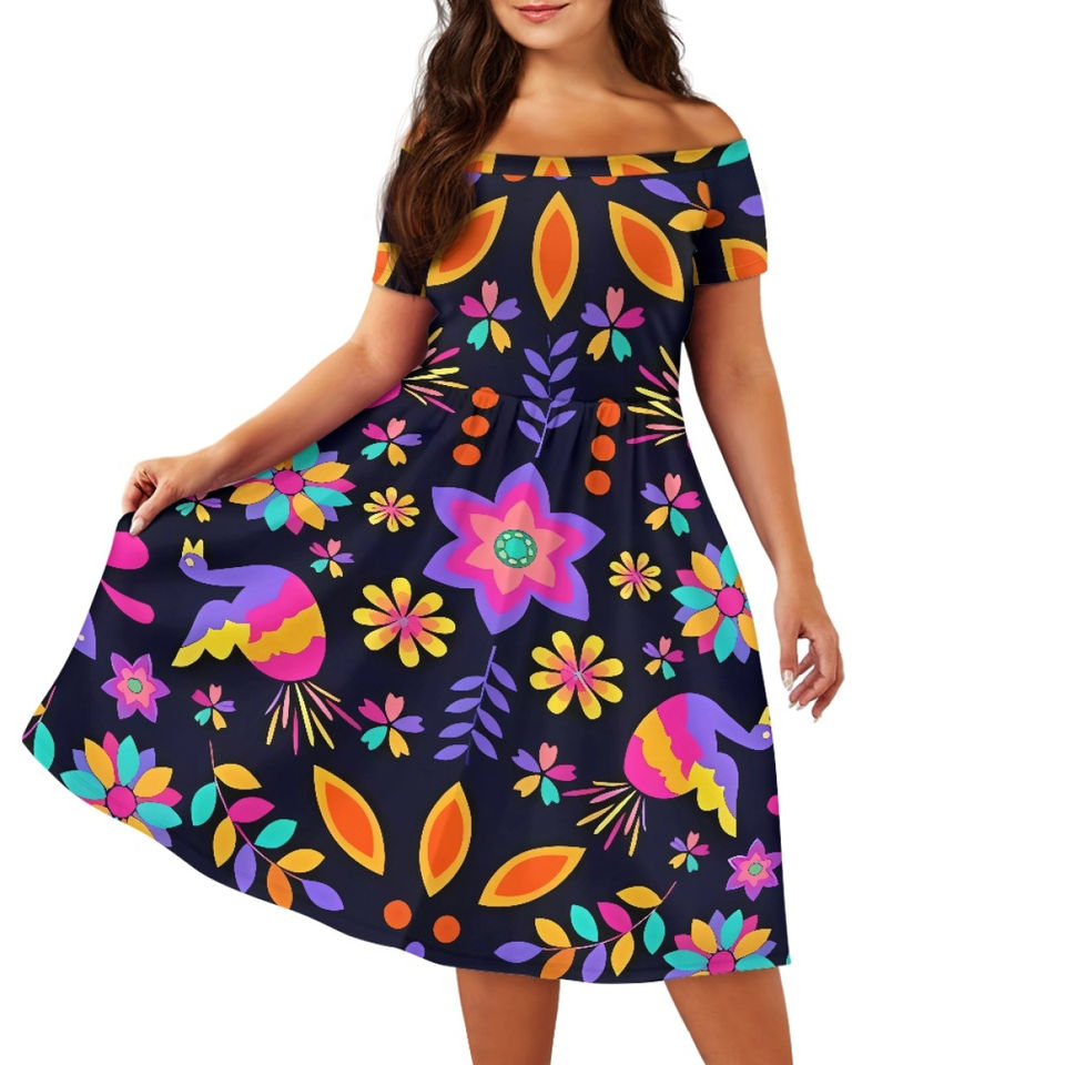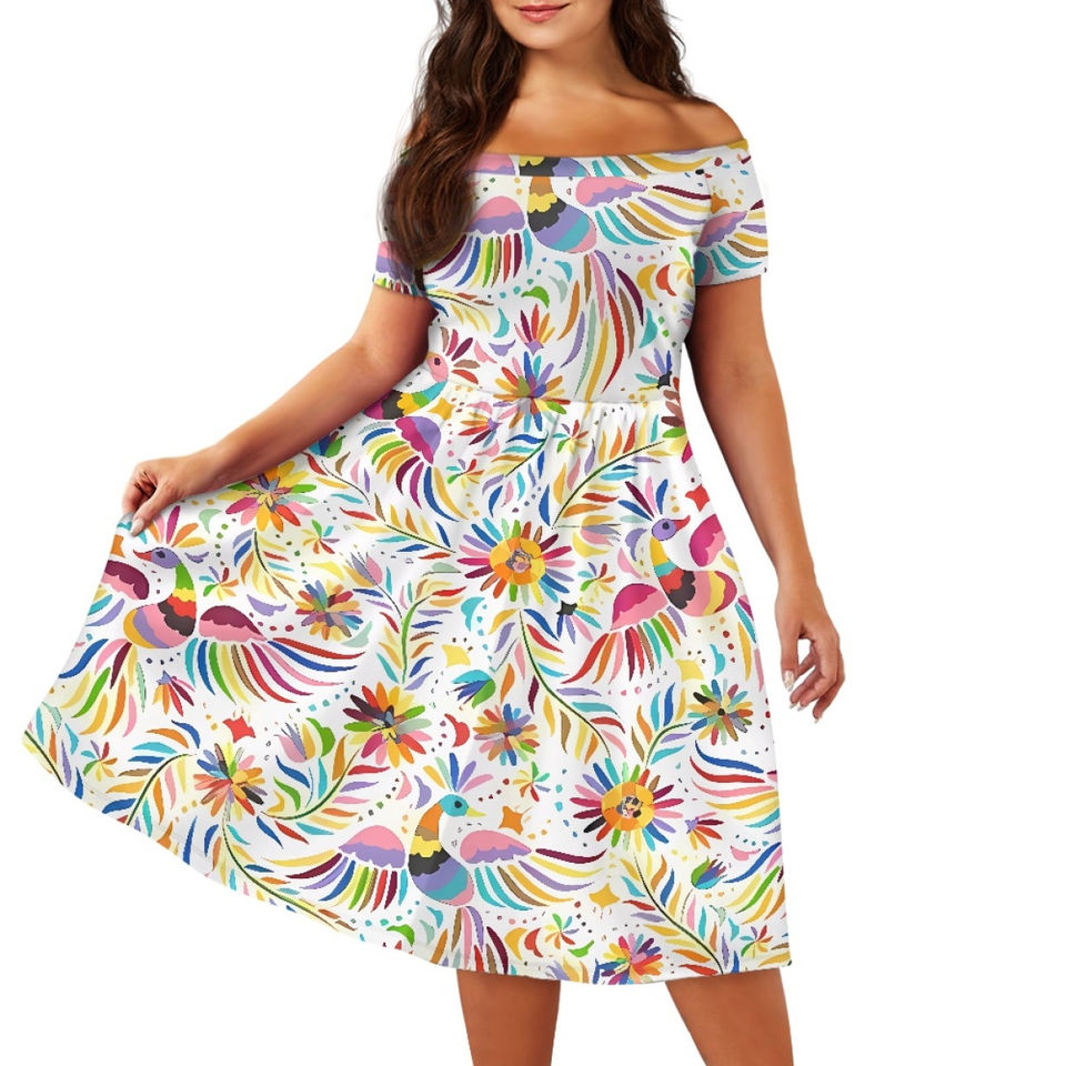 ชุดเดรสผู้หญิงพิมพ์ลายดอกไม้พื้นเมืองเม็กซิกันแบบเปิดไหล่ ขายส่งจากโรงงาน ชุดเดรสลายดอกไม้เม็กซิกัน