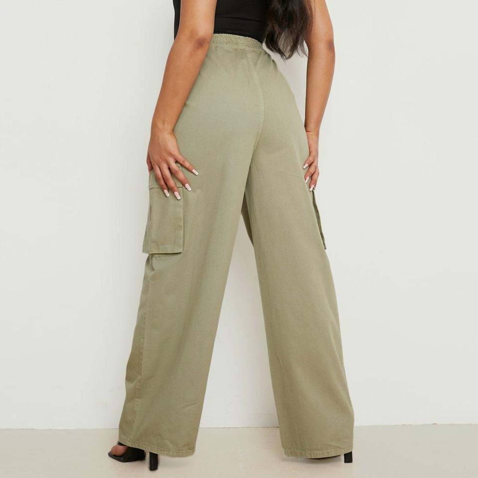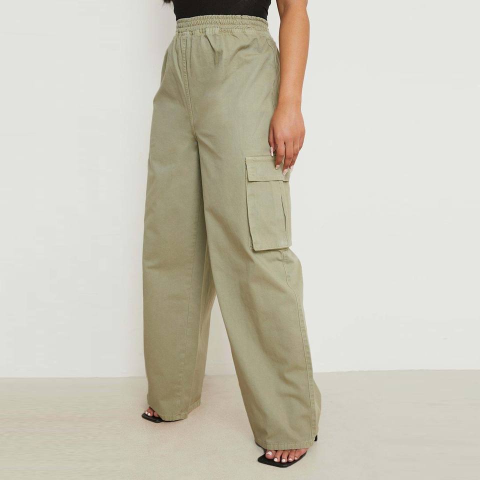 กางเกงคาร์โก้ขาตรงเอวสูงด้านหน้าเรียบแฟชั่น
