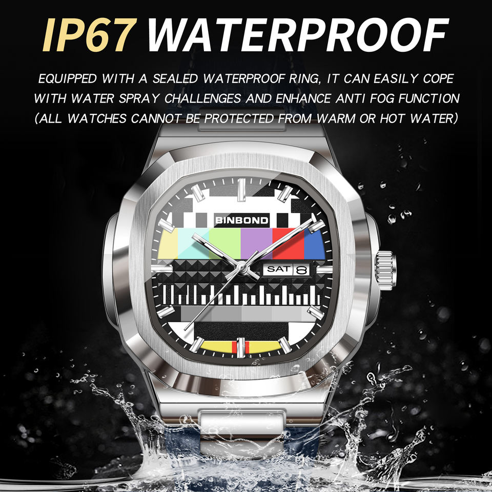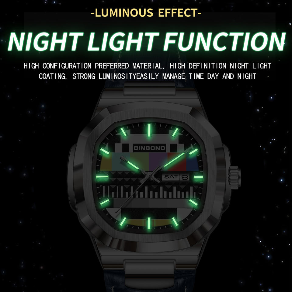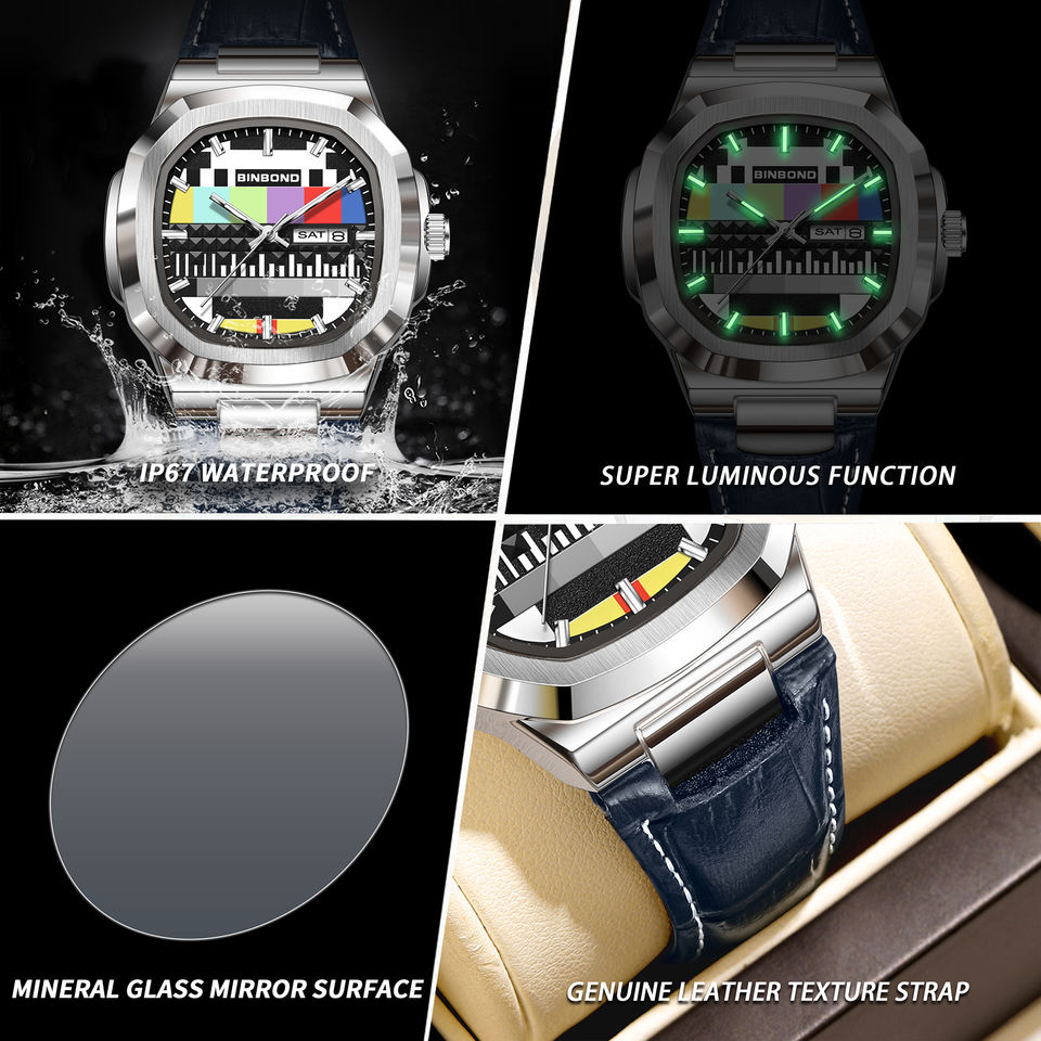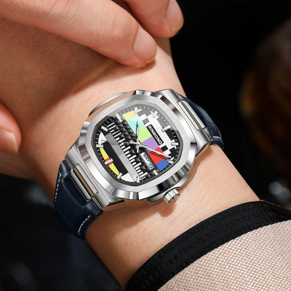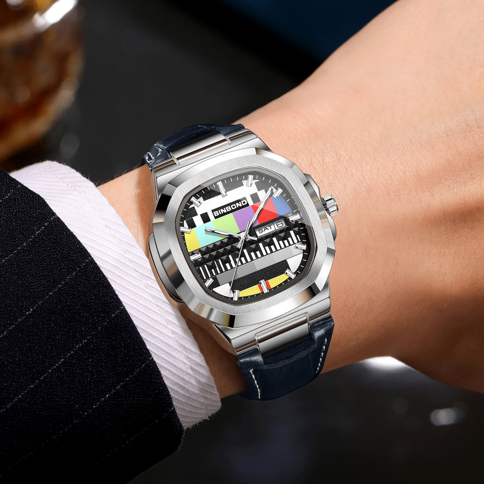 นาฬิกาข้อมือหนังผู้ชายทรงกลมควอตซ์ ดีไซน์เฉพาะกลุ่มแฟชั่น Binbond 1984 สไตล์ใหม่ ปฏิทินคู่ สไตล์ธุรกิจ กันน้ำ 30 เมตร