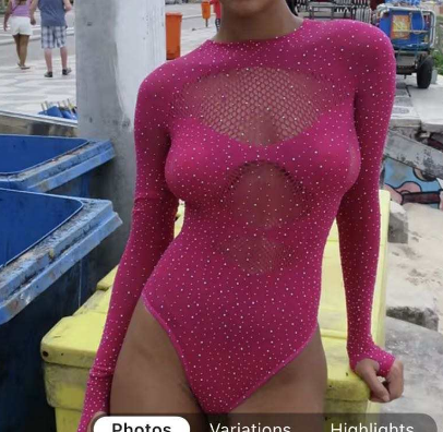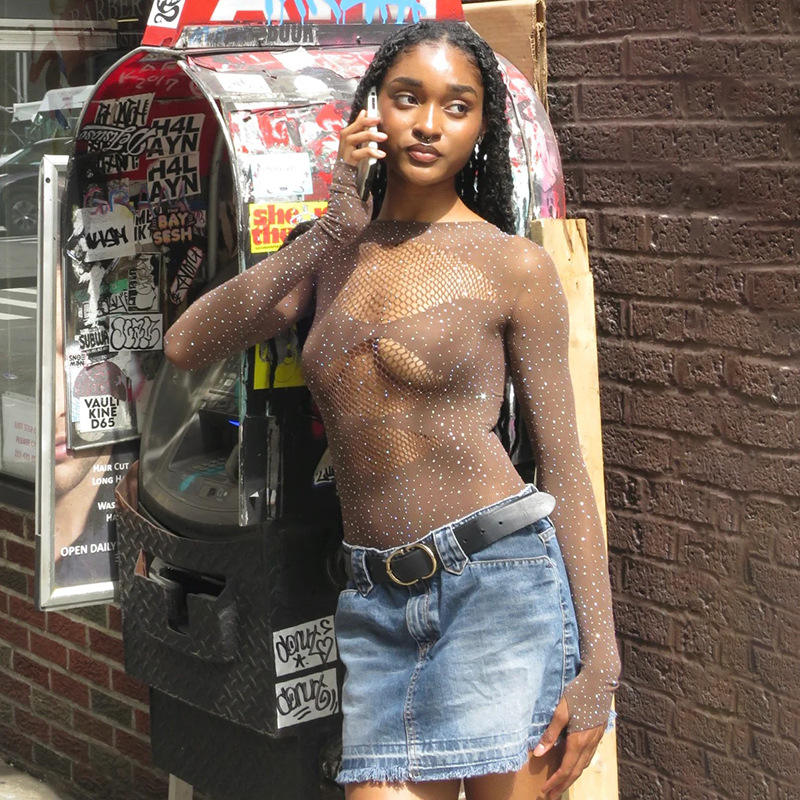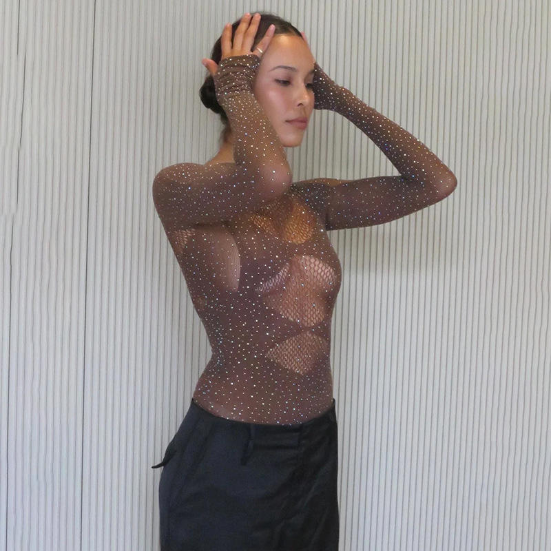 บอดี้สูทแฟชั่นลายปะติดปะต่อเว้าลายฉลุ แต่งคริสตัล ยืดหยุ่นสูง แขนยาว ทรงบอดี้คอน เสื้อผู้หญิงเซ็กซี่ จั๊มสูทประดับคริสตัล TzG125