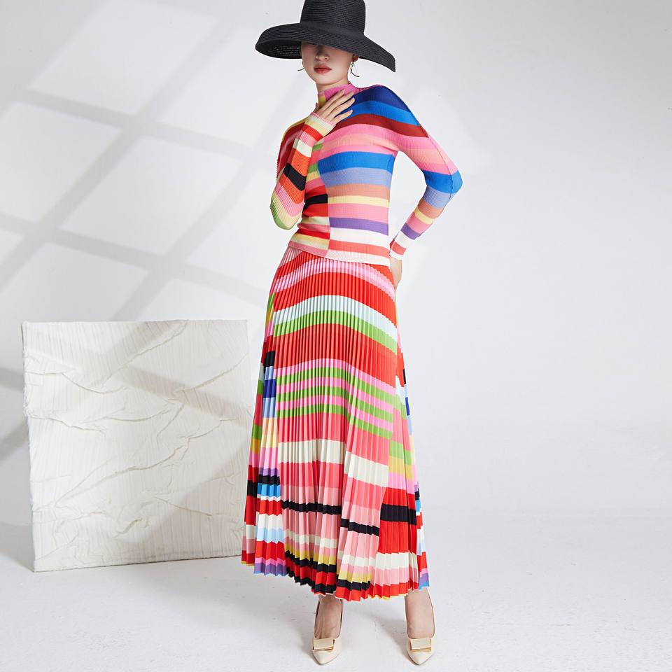 ชุดสองชิ้นเสื้อและกระโปรงพลีทสำหรับผู้หญิง, ชุดแฟชั่นพิมพ์ลายสำหรับฤดูใบไม้ผลิ/ฤดูร้อนระบายอากาศได้ดีทำจากโพลีเอสเตอร์100%