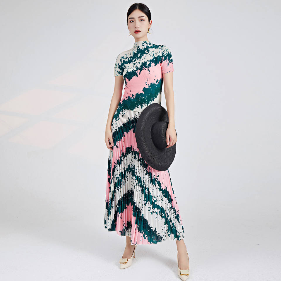 ชุดเสื้อยืดแฟชั่นมีจีบสำหรับผู้หญิง, เสื้อยืดแขนสั้นพิมพ์ลายดอกไม้2025ฤดูร้อน + กระโปรงยาวคอตั้งลำลอง