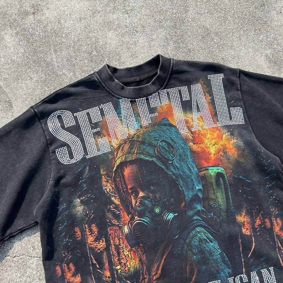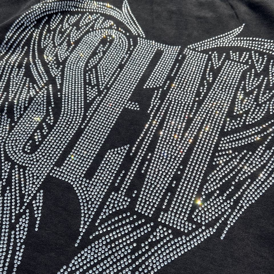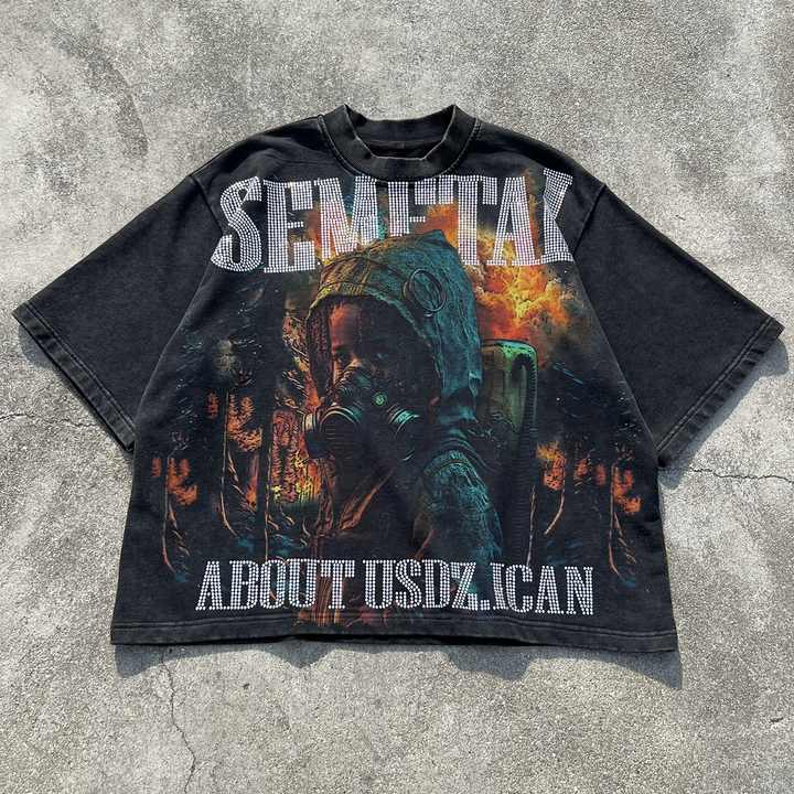 เสื้อยืดแฟชั่นพิมพ์ลายเฟรนช์เทอร์รี่ผู้ชาย เสื้อยืดโอเวอร์ไซส์แบบย้อมสีเอซิด สตรีทแวร์ ไหล่ตก ประดับเพชร เสื้อยืดลายกราฟิก