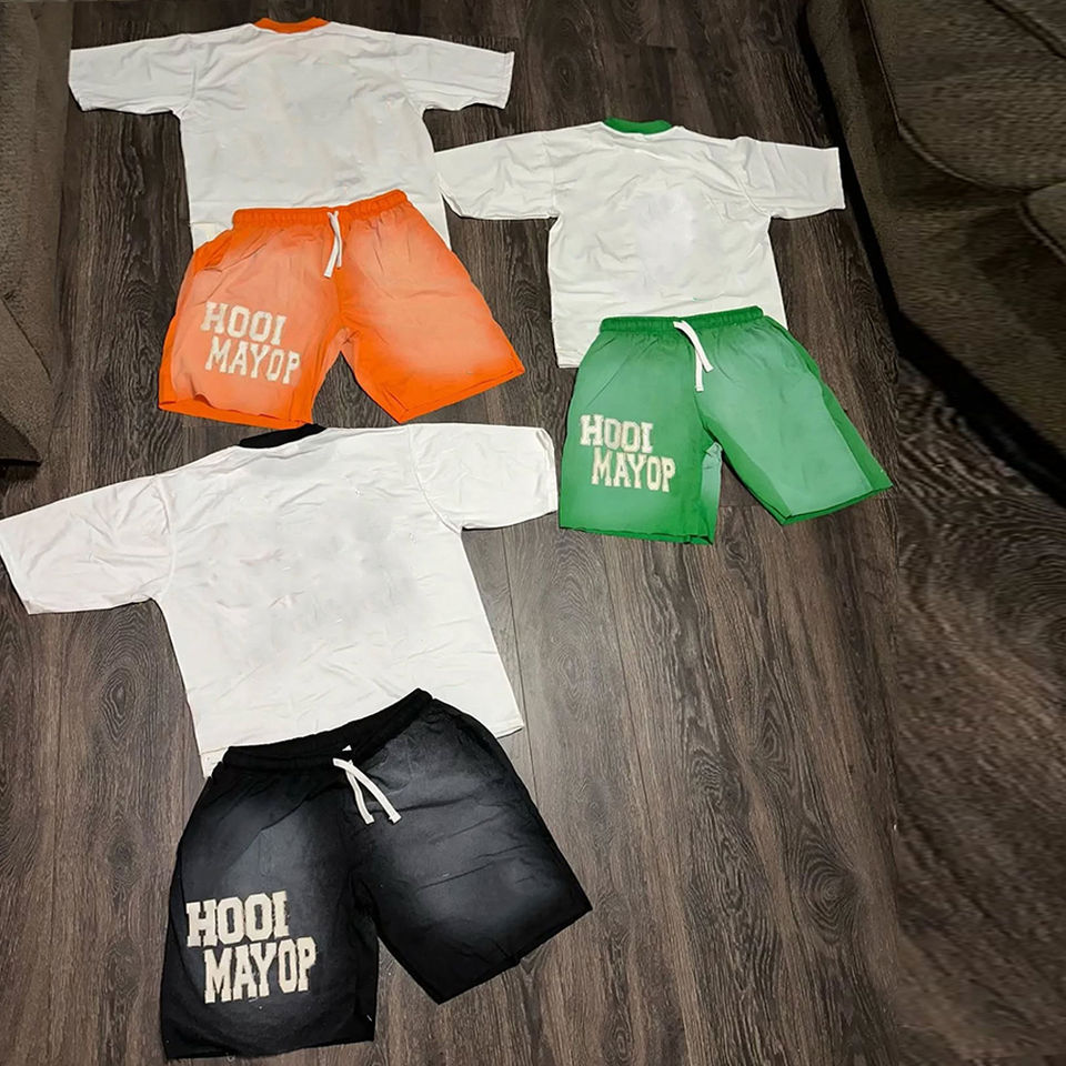 ชุดเสื้อผ้าแฟชั่นพิมพ์ลายสำหรับผู้ชายผ้าฝ้าย2ชิ้นล่าสุดชุดสั้นเสื้อยืดชุดสั้นของผู้ชายชุดสั้นกางเกงขาสั้นคุณภาพสูงสีจางลงแดด
