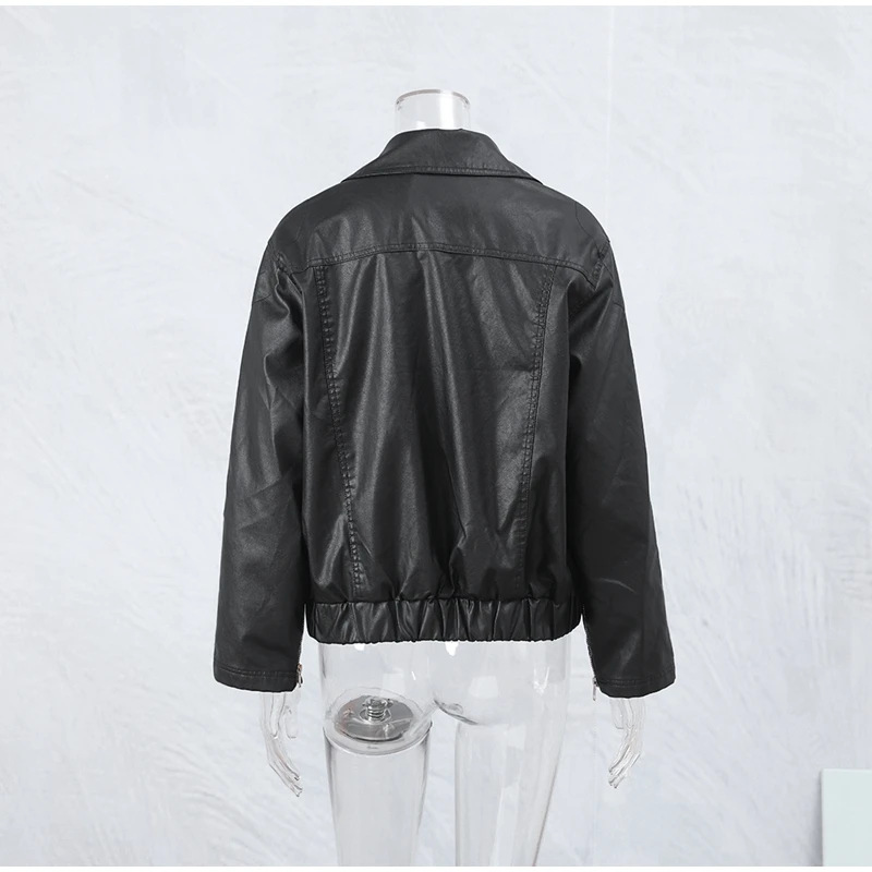 เสื้อแจ็กเก็ตหนังเทียมสำหรับผู้หญิงแฟชั่นย้อนยุคปกสีทึบปักลายโบว์แขนยาวมีซิป