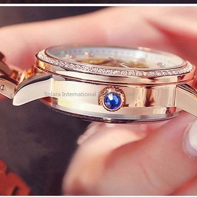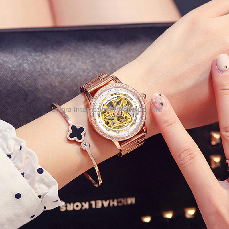 นาฬิกาแฟชั่นสีโรสโกลด์สำหรับผู้หญิง ดีไซน์หรูหรา ประดับเพชร โครงสร้างกลไกแบบโปร่ง