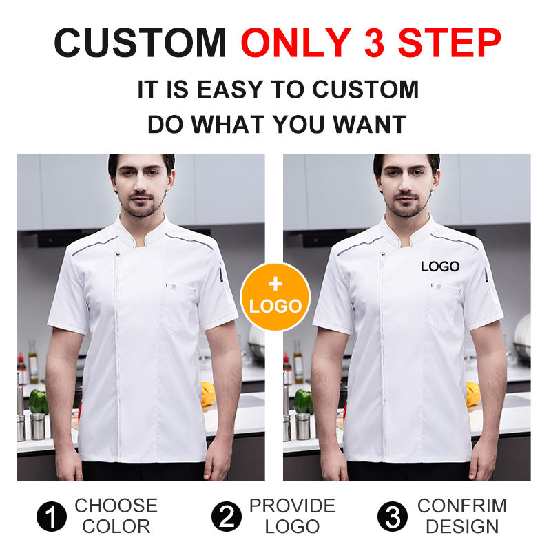 เสื้อเชฟผู้ชายเสื้อเชฟแขนสั้นแฟชั่นมีกระเป๋าสำหรับพนักงานร้านอาหารโรงอาหารสั่งทำโลโก้ได้ตามต้องการ