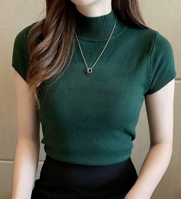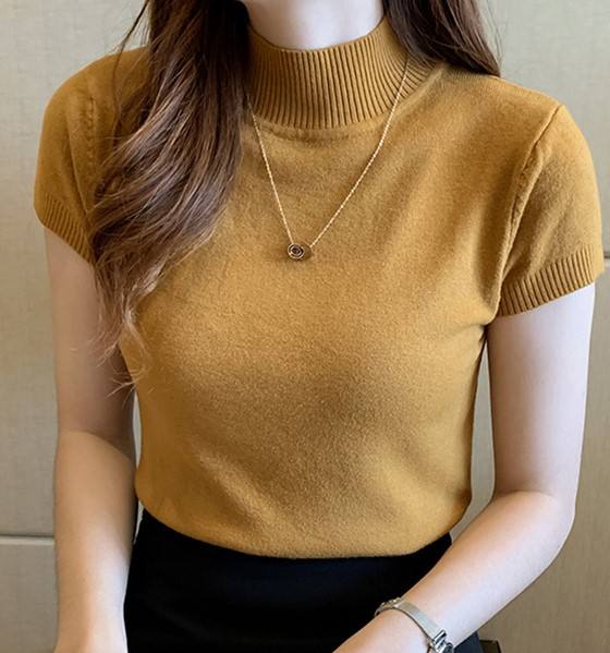 เสื้อยืดแฟชั่นแขนสั้นคอวีสำหรับผู้หญิง ผ้าถักยืดหยุ่น ตกแต่งด้วยผ้าปะติดและกระดุมแบบรักษ์โลก เสื้อลำลองสไตล์สปริงสีพื้น