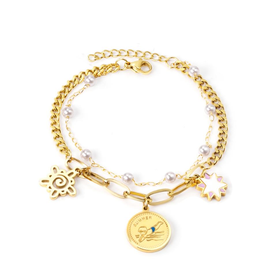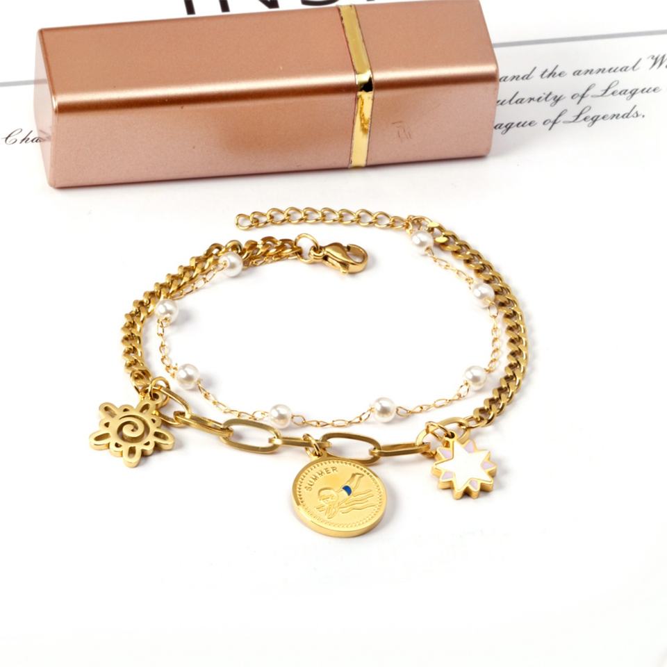 สร้อยข้อมือแฟชั่นเรียบง่าย สแตนเลสสตีล ชุบทอง 18k แบบสองชั้น สำหรับสุภาพสตรี