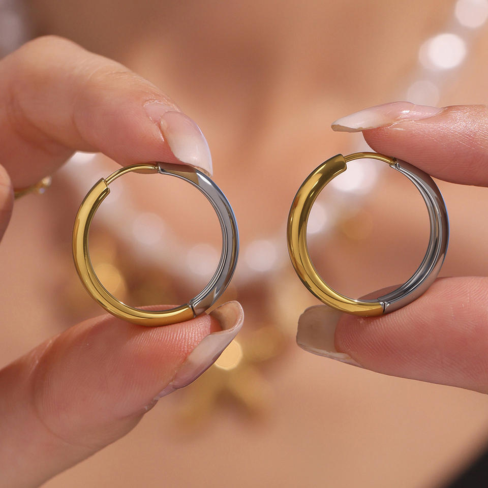 ต่างหูห่วงวงกลมสองสีเรียบง่าย แฟชั่นทันสมัย ชุบทอง 18K สแตนเลสสตีล เครื่องประดับแบบมินิมอล
