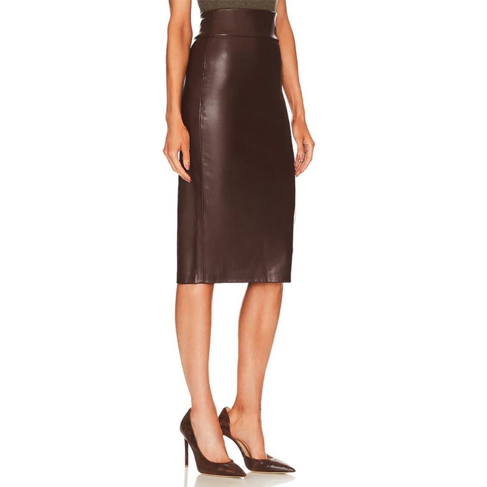 กระโปรงทรงดินสอหนังเทียมวีแกนสีพื้นแบบสลิมฟิตสำหรับผู้หญิง ความยาวระดับเข่า มีซิปด้านหลัง