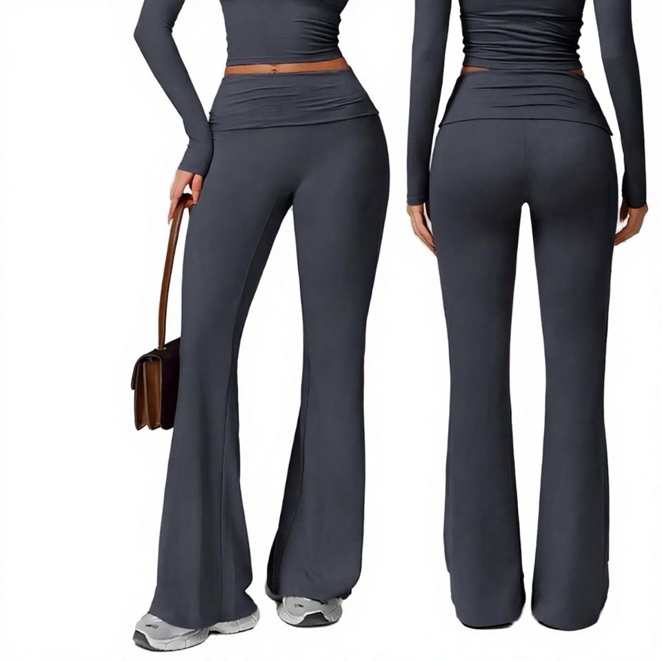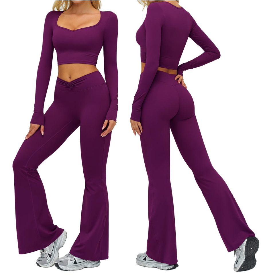 ชุดโยคะแฟชั่นสีพื้นเอวสูง คอลึกเซ็กซี่ แขนยาว กางเกงขาบาน น้ำหนักเบา แห้งเร็ว ระบายอากาศได้ดี 2 ชิ้น