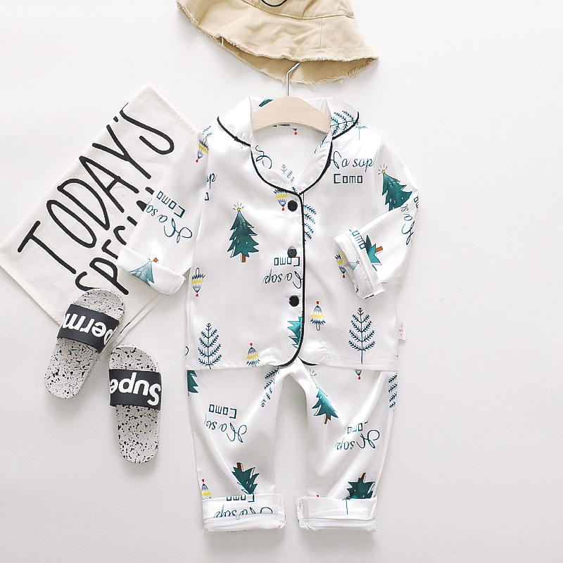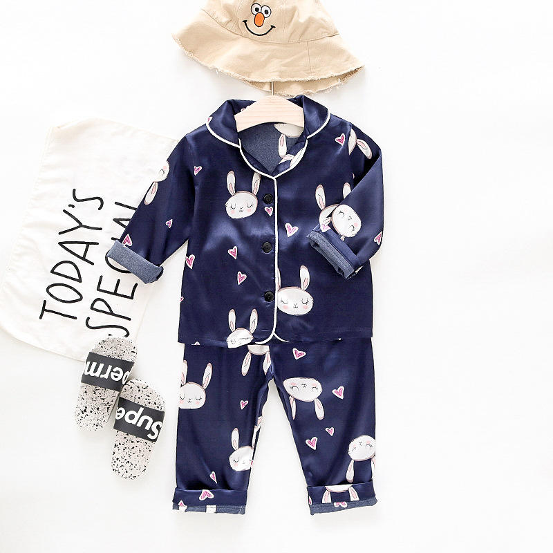 ชุดนอนเด็กผ้าไหมซาตินพิมพ์ลายการ์ตูนแขนยาวสำหรับเด็กชายและเด็กหญิง