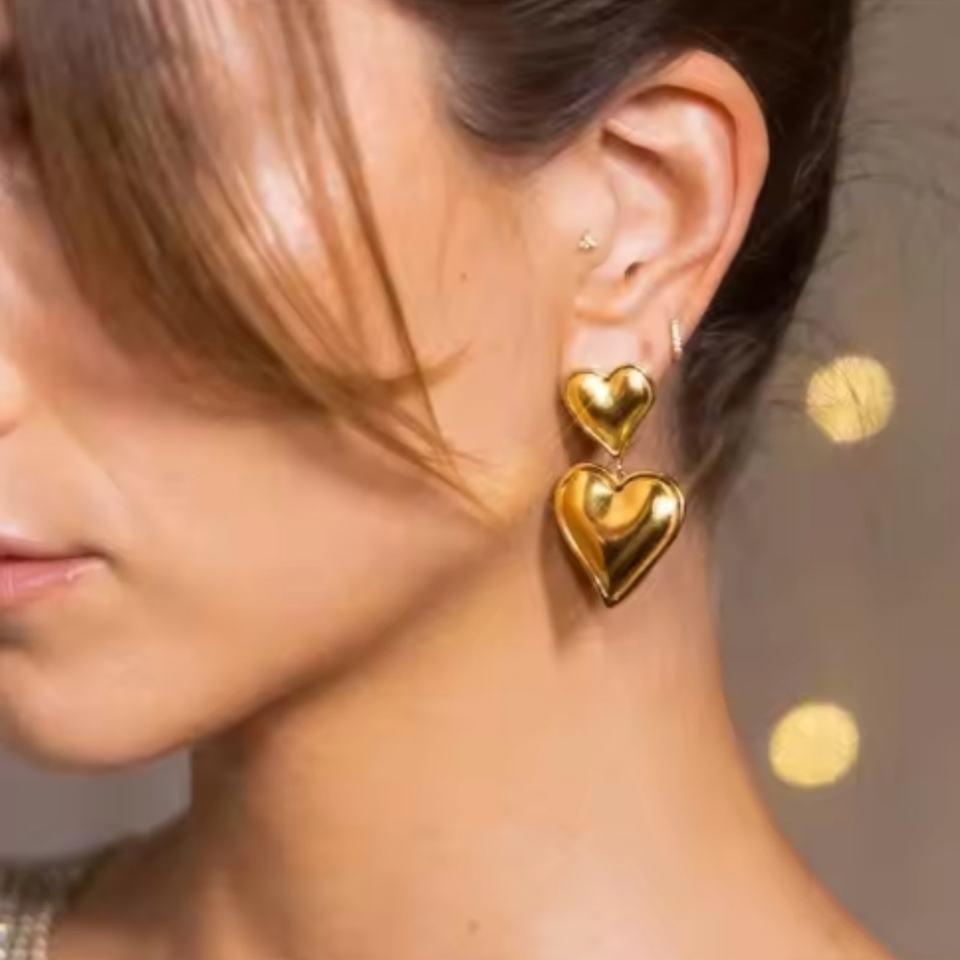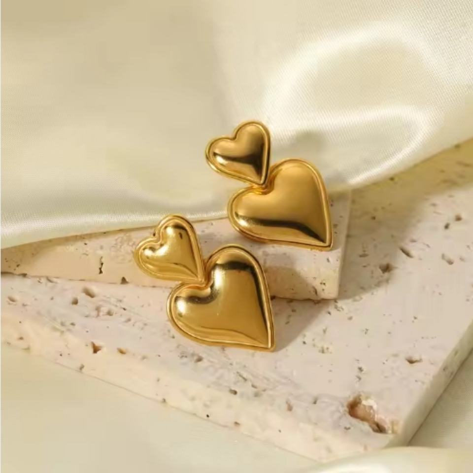ต่างหูแฟชั่นสแตนเลสสตีลเคลือบทอง 18K รูปหัวใจคู่ ดีไซน์เรียบหรู ทันสมัย ไม่หมอง สำหรับผู้หญิง