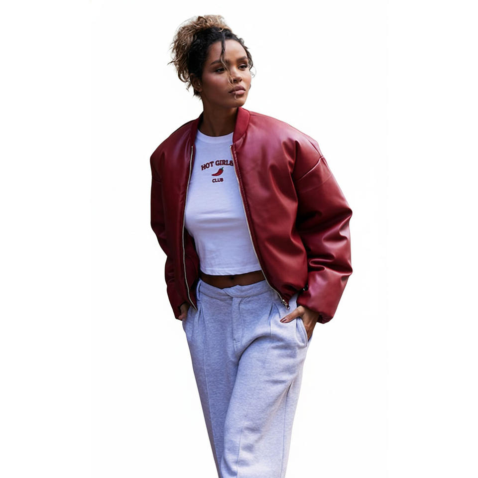 เสื้อแจ็คเก็ตหนัง PU สไตล์สตรีทแวร์สำหรับผู้หญิง แขนยาว ทรงบอมเบอร์ สั้น