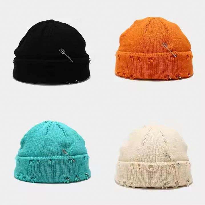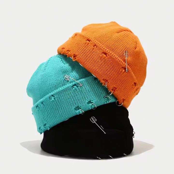 หมวกบีนนี่ไหมพรมทรงสตรีทแวร์แบบสวมสบาย แต่งขอบยับ ถักแบบสองด้าน วัสดุอะคริลิก พร้อมเข็มกลัดนิรภัย