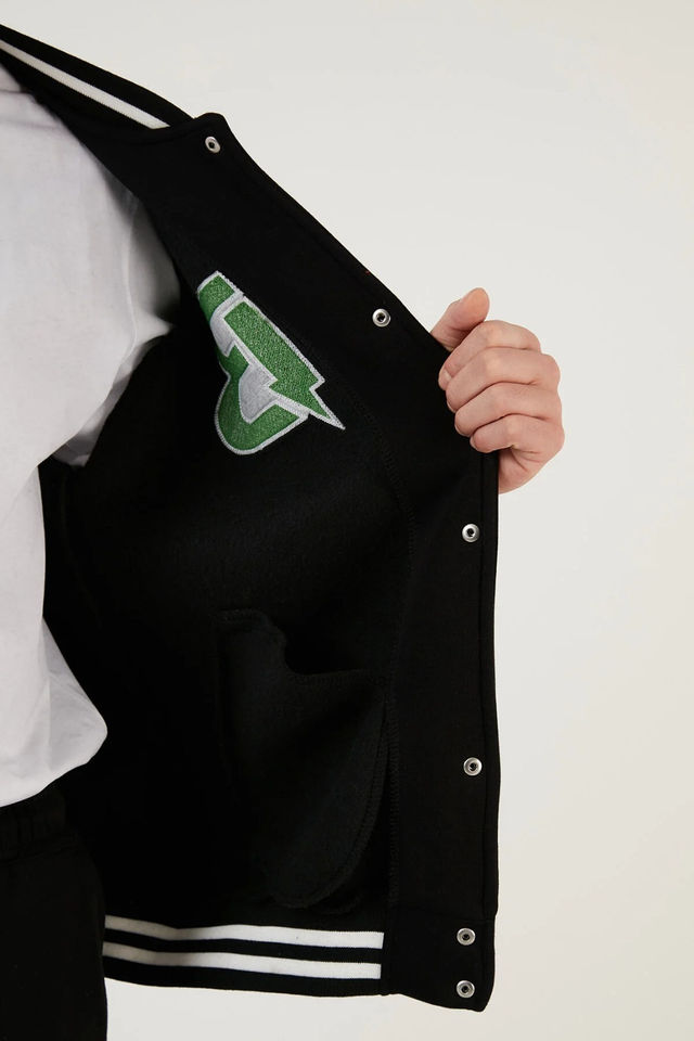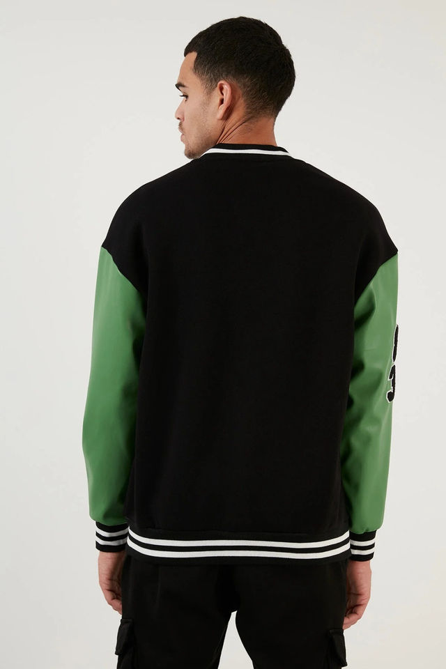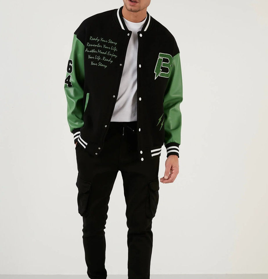 แจ็คเก็ตบอมเบอร์ผู้ชาย แขนหนังตัดสี คอเสื้อถักลายทาง แต่งผ้าปักลายเชนิลล์