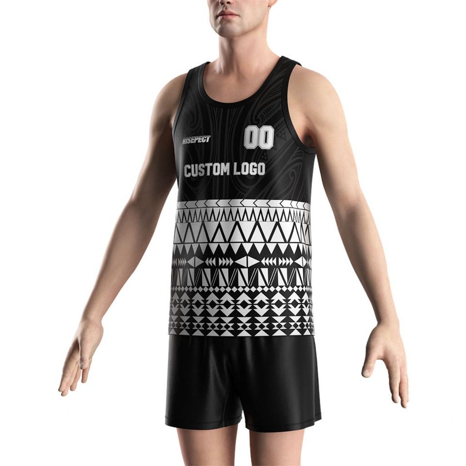 เสื้อยืดรักบี้สีดำขาว พิมพ์ลายแบบซับลิเมชั่น ไซส์พลัส สำหรับออกกำลังกาย เสื้อกล้ามผู้ชาย แขนกุด