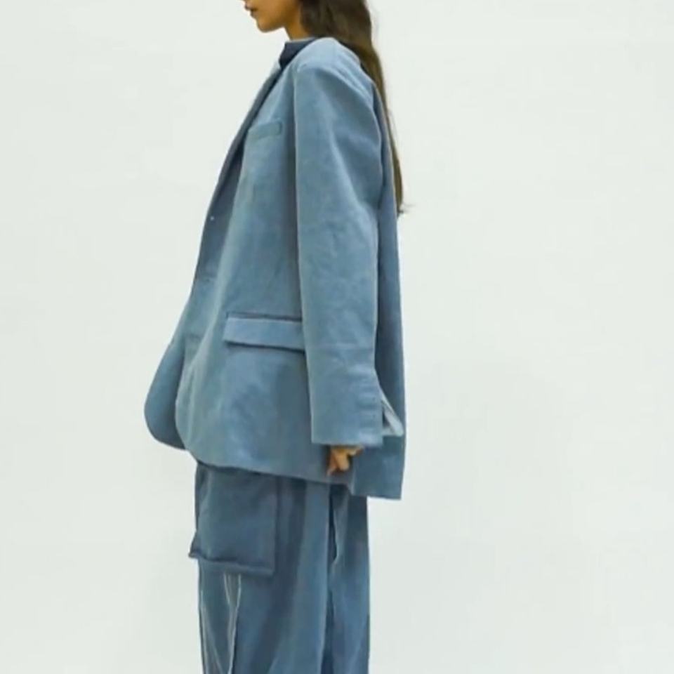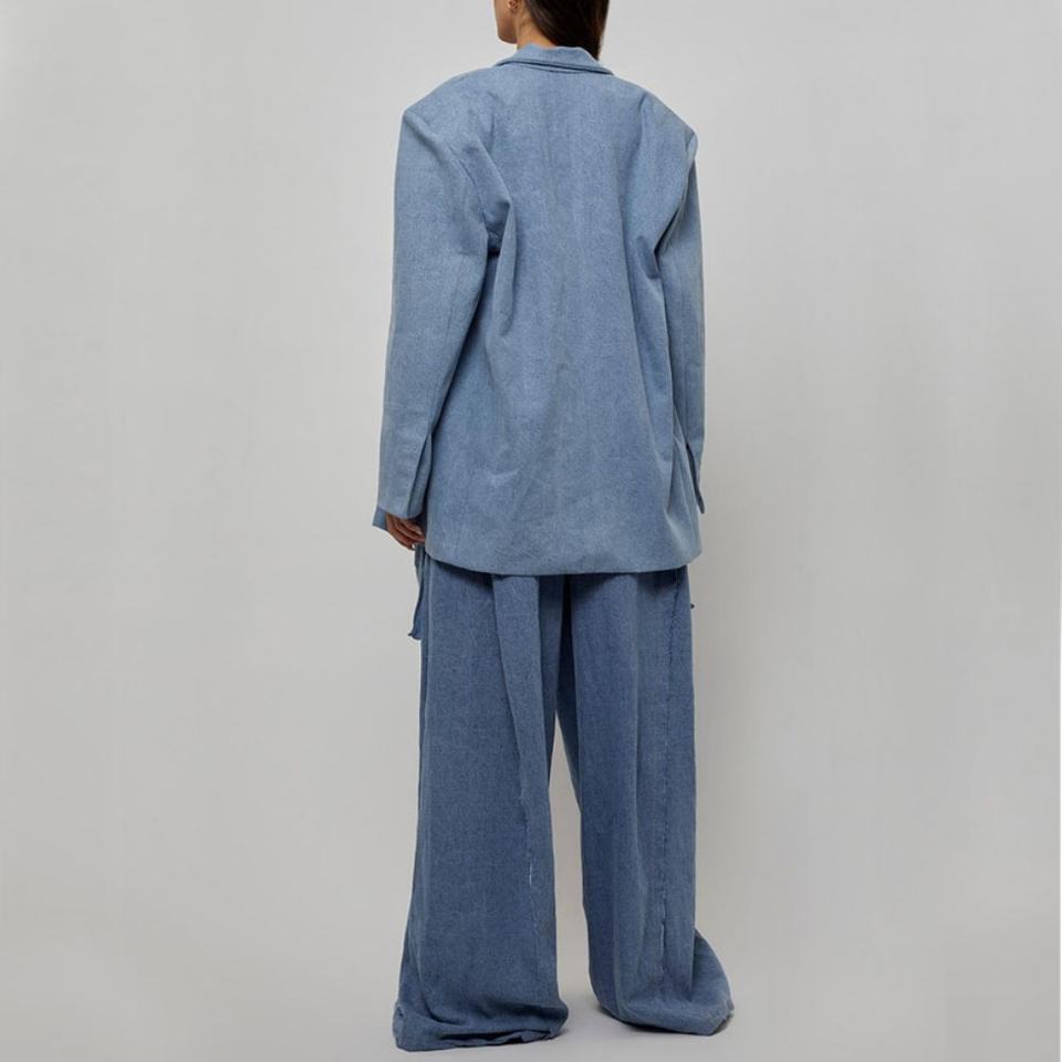 เสื้อแจ็คเก็ตยีนส์สีน้ำเงินทรงโอเวอร์ไซส์สำหรับผู้หญิง แบบมีกระเป๋าปิดสองช่อง สไตล์แฟชั่นสูท