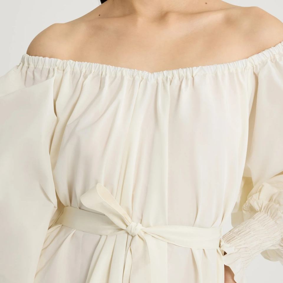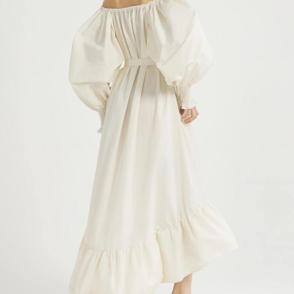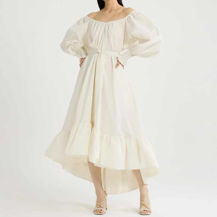 ชุดเดรสฤดูร้อนสำหรับผู้หญิง ดีไซน์หรูหรา ทรงหลวม เปิดไหล่ สีพื้น แต่งเข็มขัด เหมาะสำหรับใส่ไปชายหาด