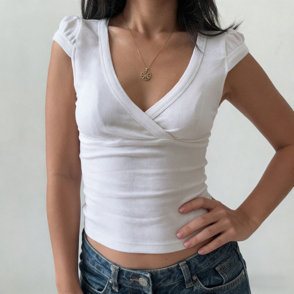 เสื้อยืดแฟชั่นฤดูร้อนสไตล์ Y2K สำหรับผู้หญิง สีพื้น คอวี ดีไซน์ไขว้ด้านหน้า แขนสั้น ทรงเข้ารูป