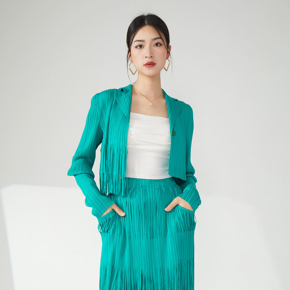 สูทแฟชั่นมีพู่จีบสำหรับผู้หญิงเสื้อโค้ทดีไซน์เนอร์ Miyake แบบสั้นอเนกประสงค์สำหรับ2025ฤดูใบไม้ผลิจัดส่งเร็ว