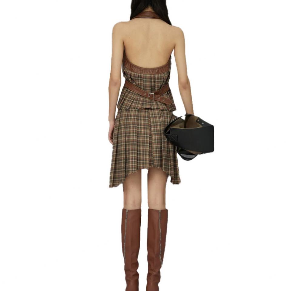 แฟชั่นวินเทจเซ็กซี่ซีรีส์เสื้อหนังคอปกสีน้ำตาลและกระโปรงสั้นชุดสองชิ้น